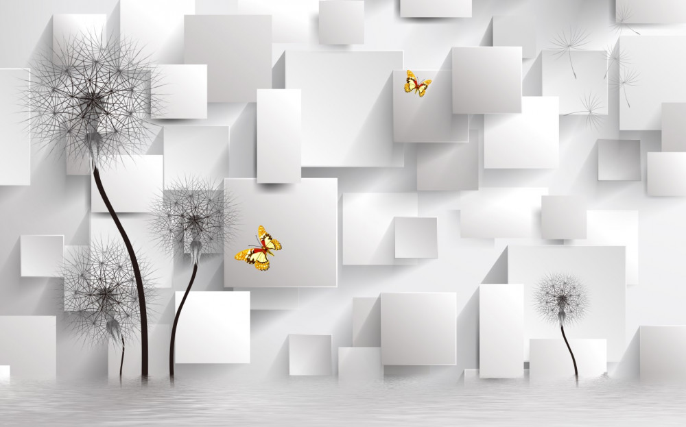 Fotomurales Dientes de león sobre un fondo de cuadrados blancos abstractos (artículo a90215 ) de la categoría Fotomurales Flores 3d