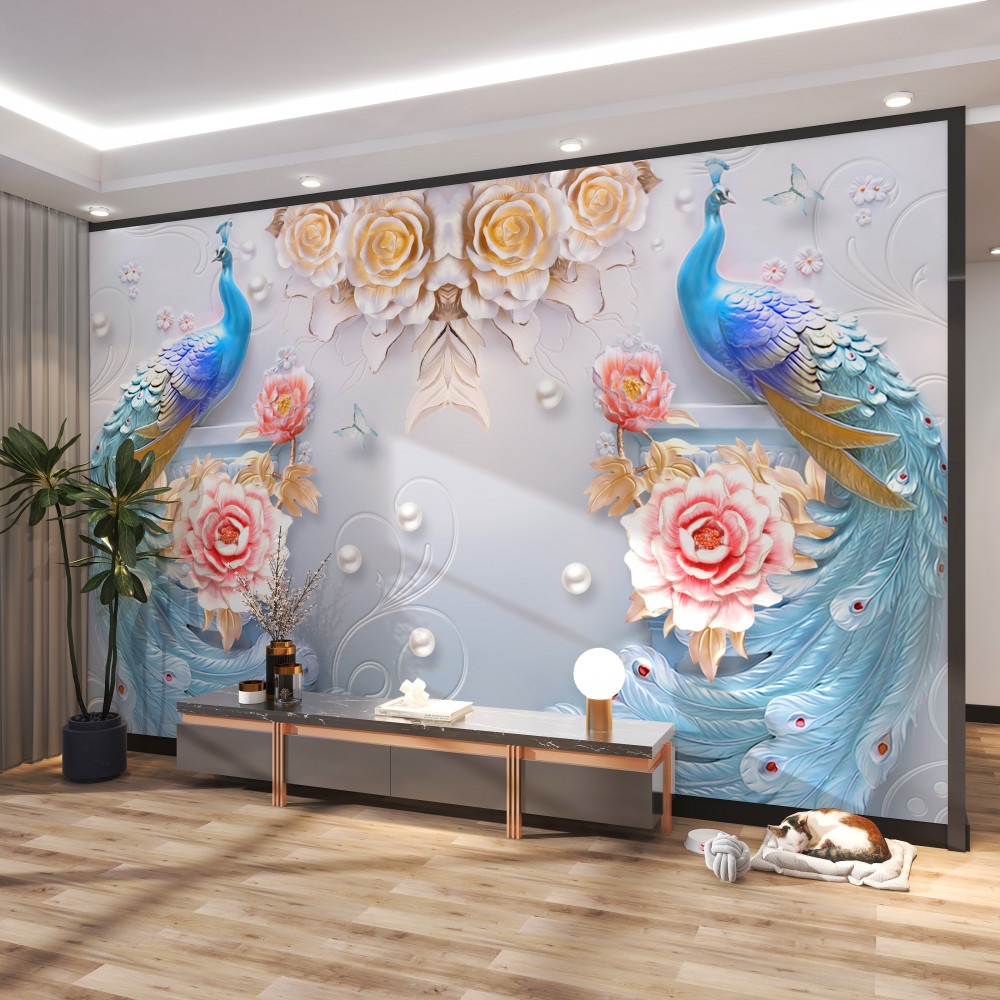 Fotomurales Dos espléndidos pavos reales y rosas rosadas (artículo a90226 ) de la categoría Fotomurales Flores 3d