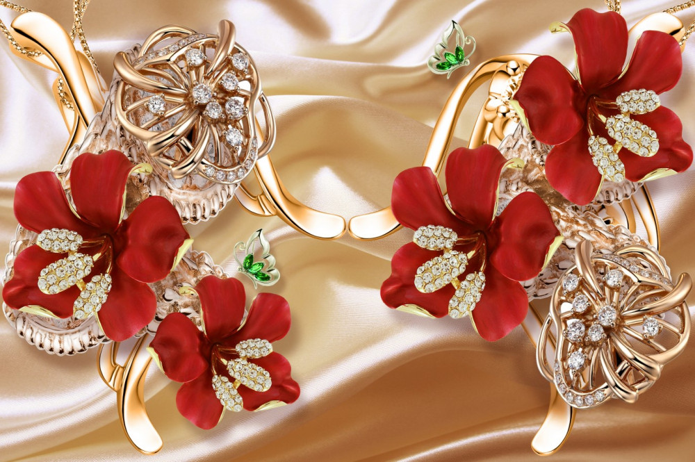 Fotomurales Flores rojas en seda dorada con decoraciones (artículo a91111 ) de la categoría Fotomurales 3D