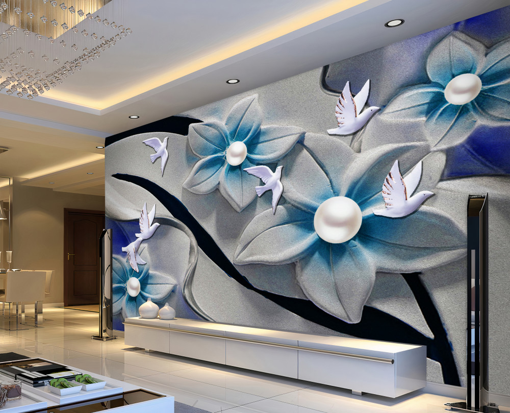 Fotomurales Flores azules y mariposas sobre fondo blanco