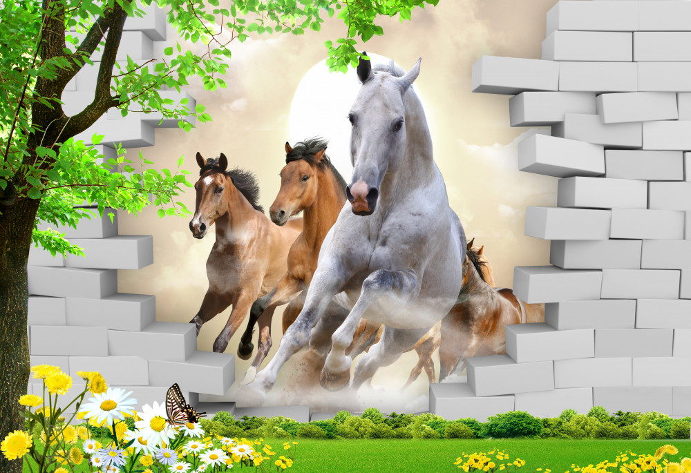 Fotomurales Galope de diferentes caballos que rompen un ladrillo (artículo a89363 ) de la categoría Fotomurales Caballos