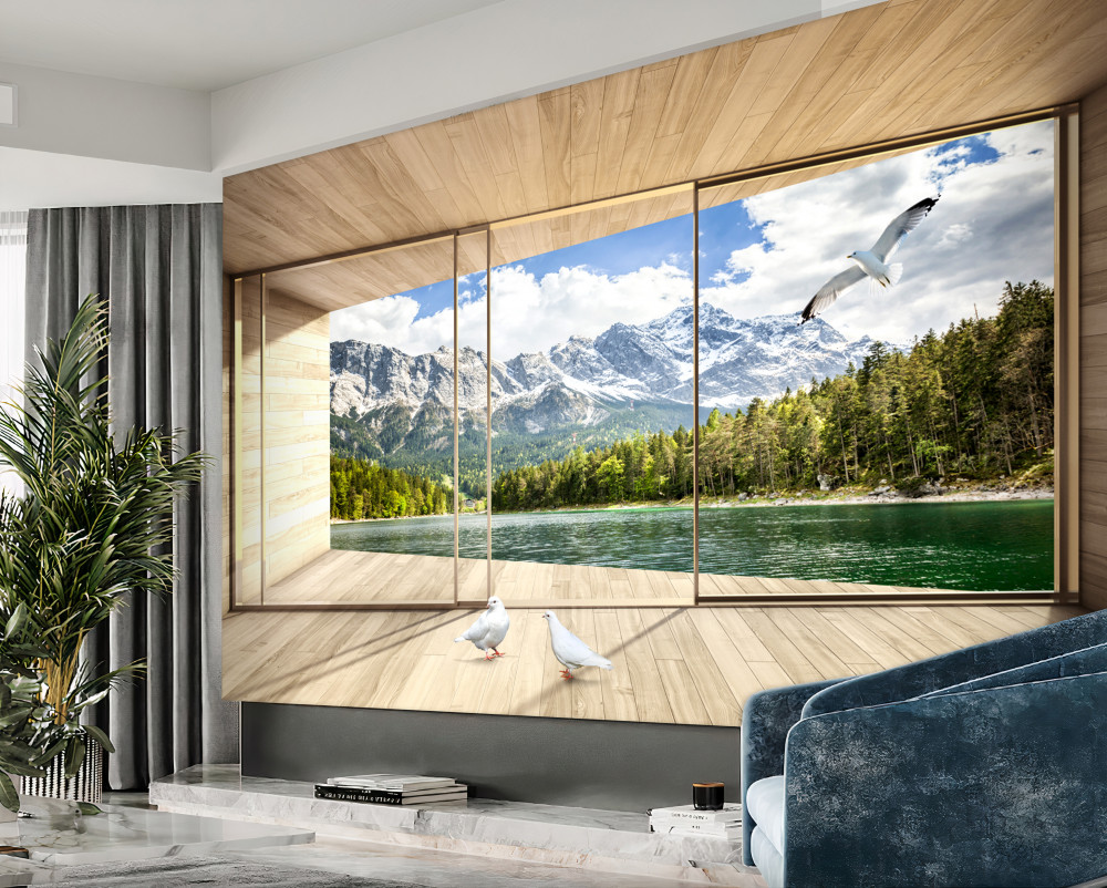 Fotomurales Flores de cereza contra el fondo de las montañas y el agua