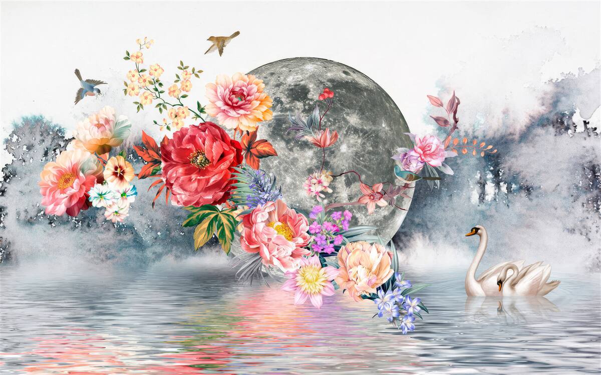 Fotomurales Flores, luna llena y pájaros (artículo a97455 ) de la categoría Fotomurales Floral
