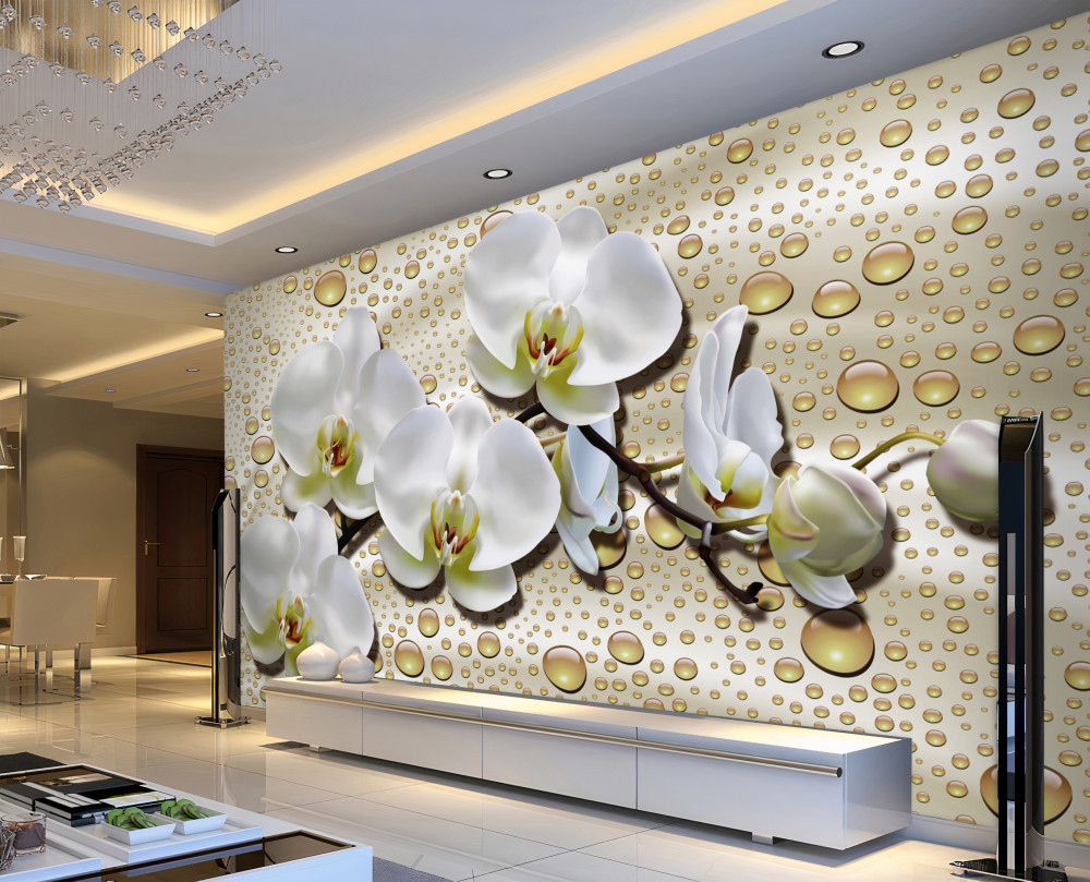 Fotomurales Rama de orquídeas blancas después de la lluvia en la seda (artículo a88444 ) de la categoría Fotomurales Floral
