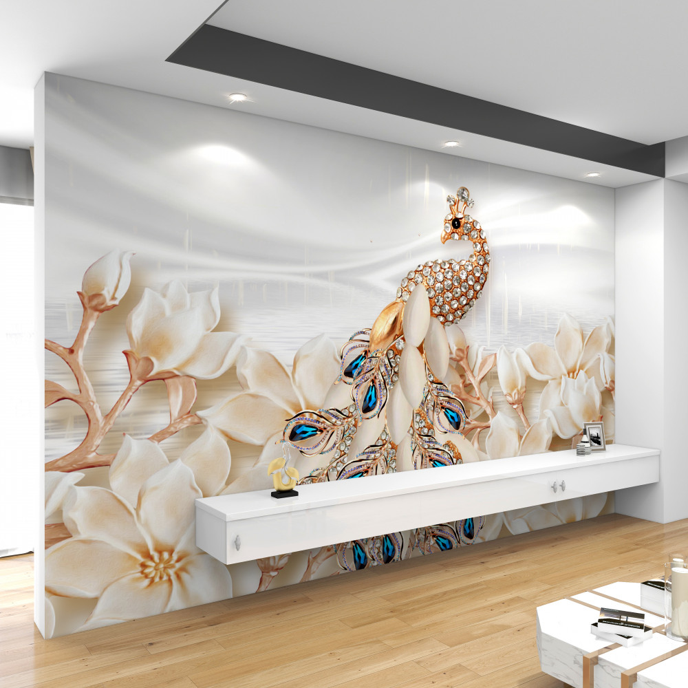 Fotomurales Hermoso pavo real en una rama con flores