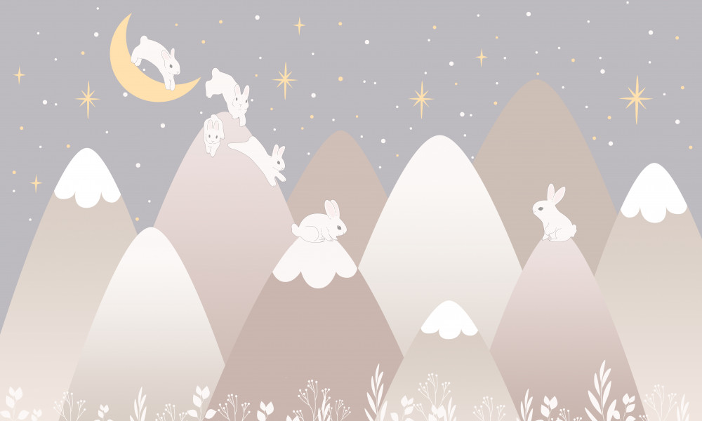 Fotomurales Conejitos blancos saltando sobre las montañas pintadas (artículo a93901 ) de la categoría Fotomurales Para un niño