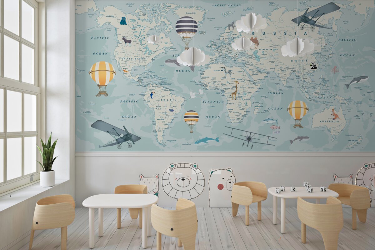 Fotomurales Mapa mundial con transporte y habitantes (artículo a98711 ) de la categoría Fotomurales Infantiles