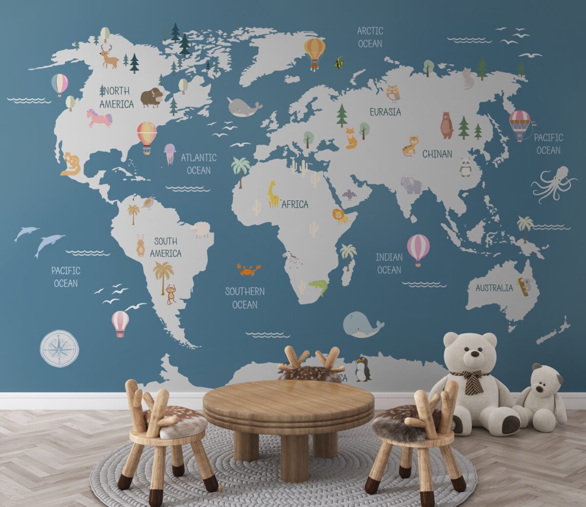 Fotomurales Mapa mundial sobre fondo azul oscuro (artículo a94100 ) de la categoría Fotomurales Infantiles