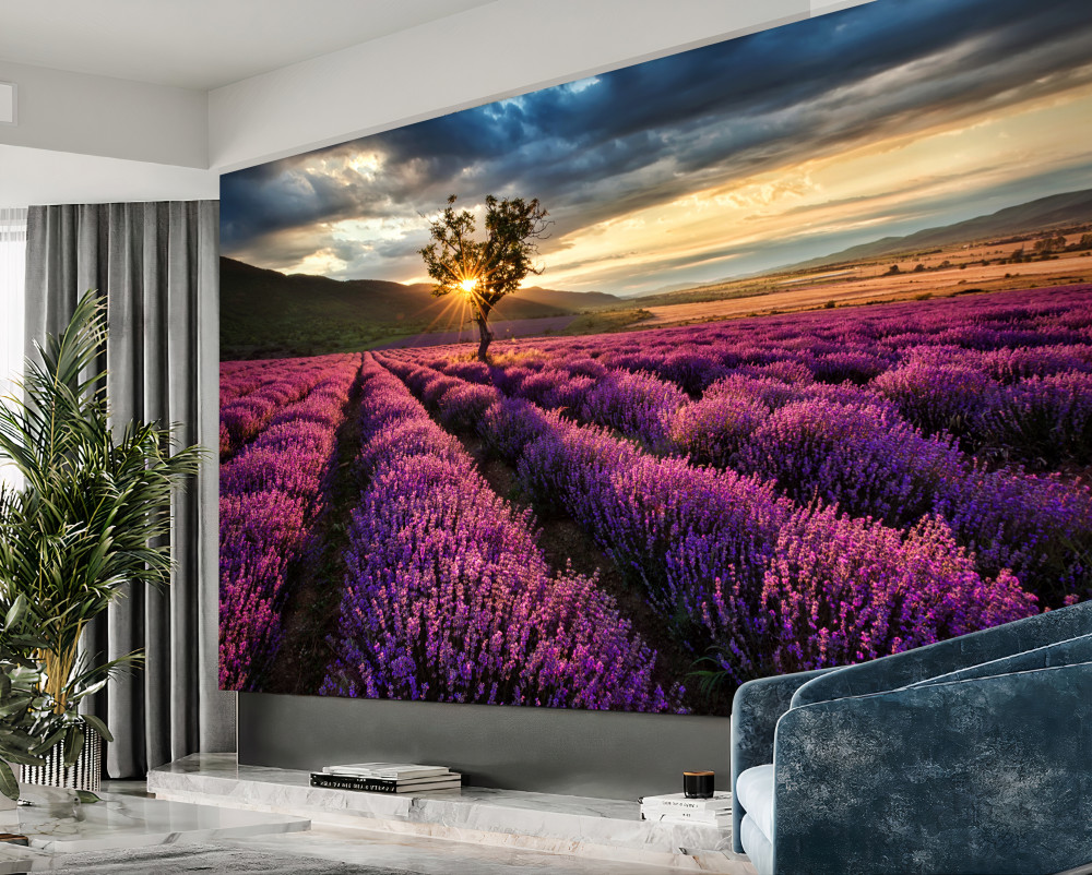 Fotomurales Árbol solitario en un campo de lavanda al atardecer