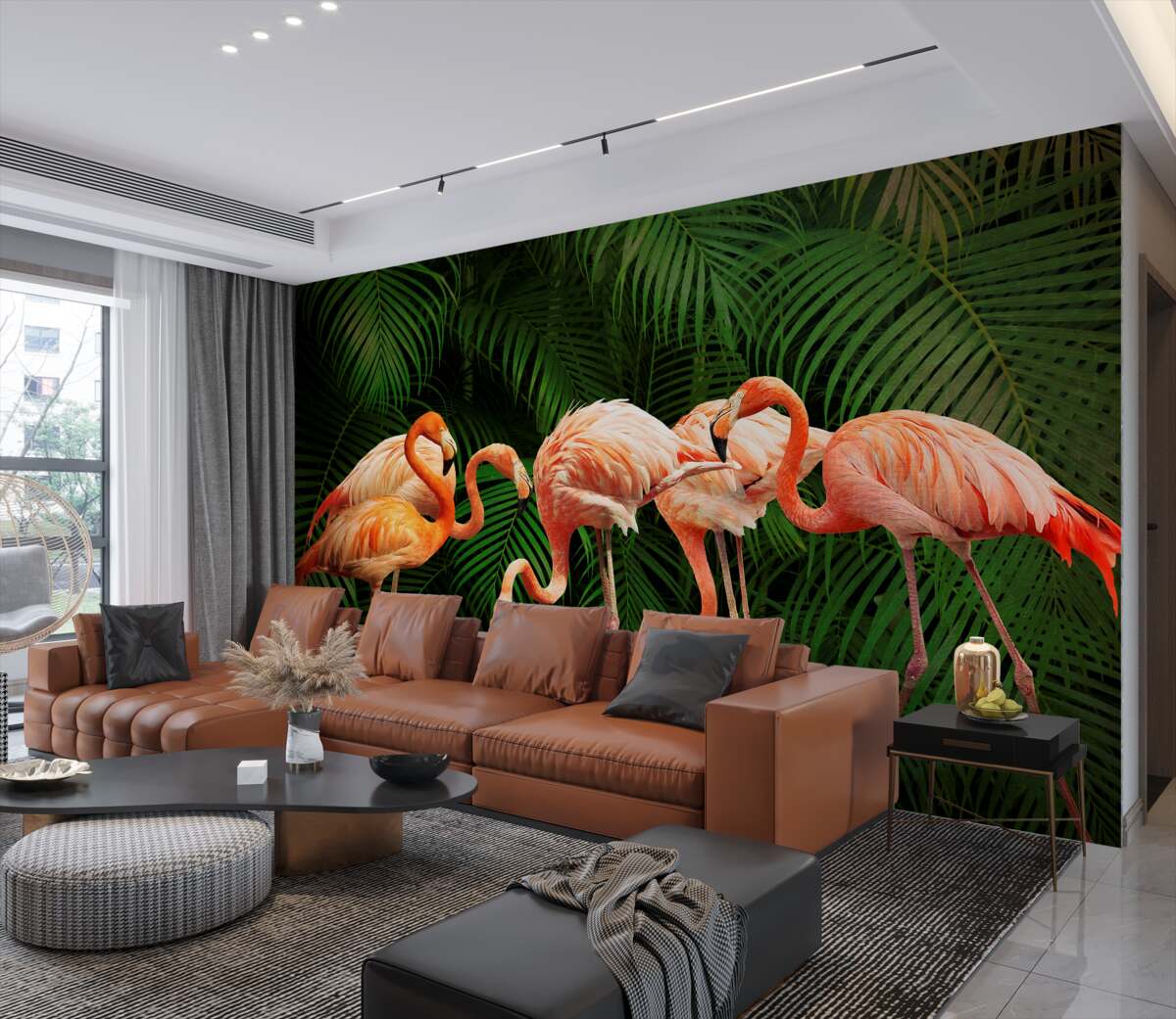 Fotomurales Flamencos rosados ​​en el bosque verde (artículo a98744 ) de la categoría Fotomurales Naturaleza