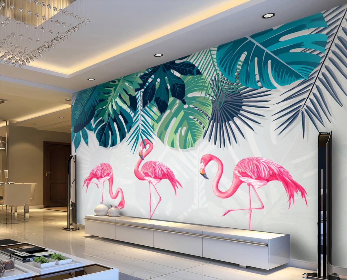 Fotomurales flamencos rosados ​​en plantas tropicales